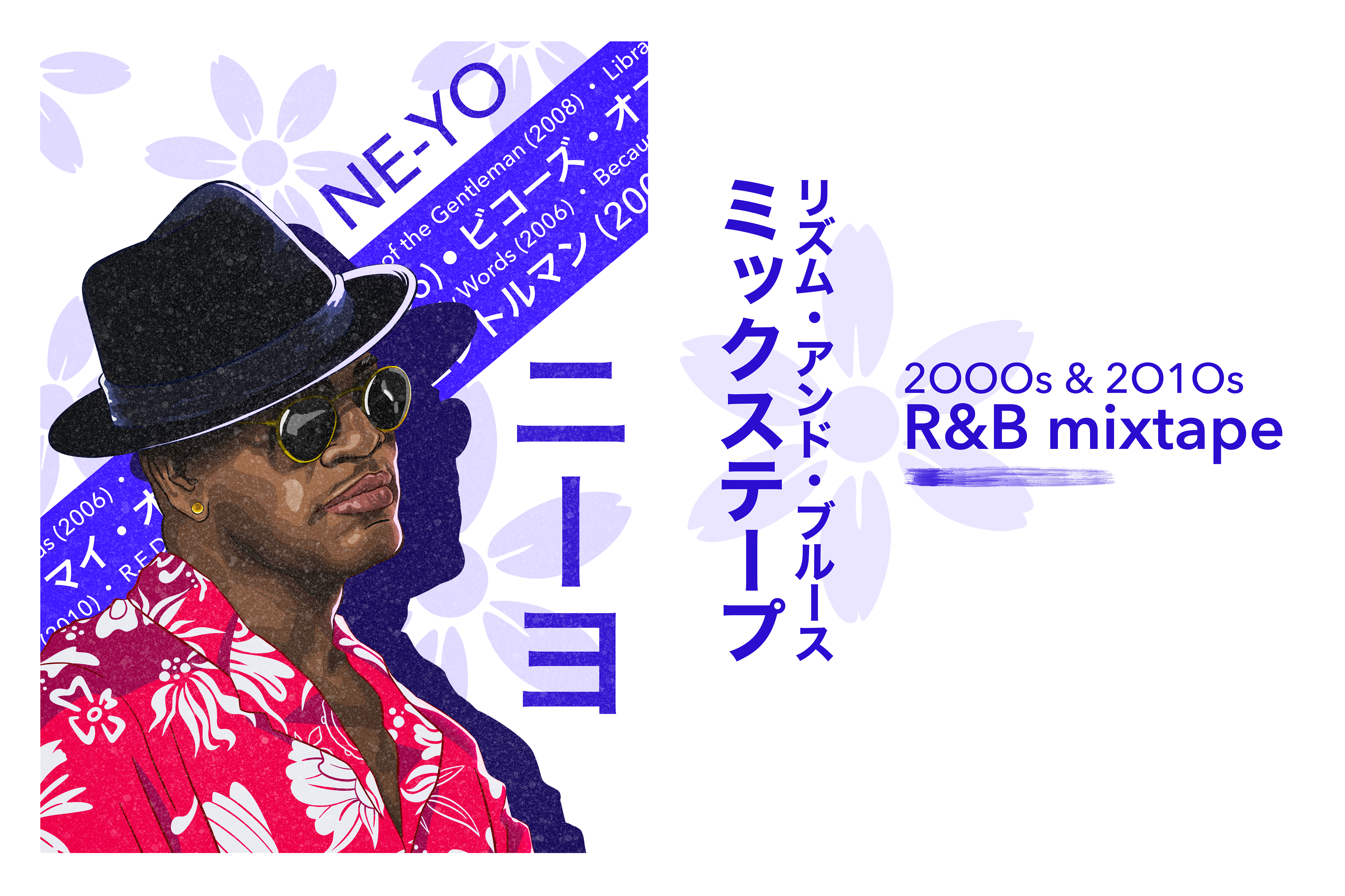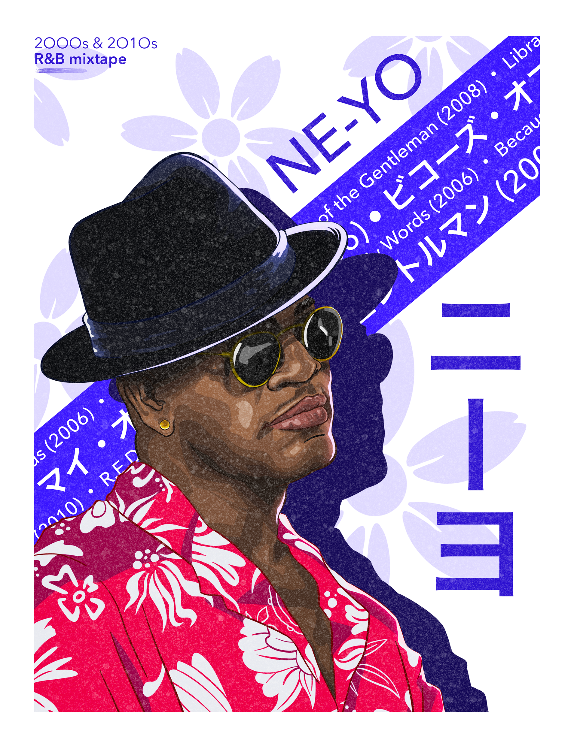 Ne-Yo - '2000's & 2010's R&B mixtape' poster design is the second in a series of posters I made as a tribute to some of my favorite singers and modern R&B's biggest exponents. It conjugates digital illustration, Japanese letters (know as katakana), graphic design and a vintage style.
